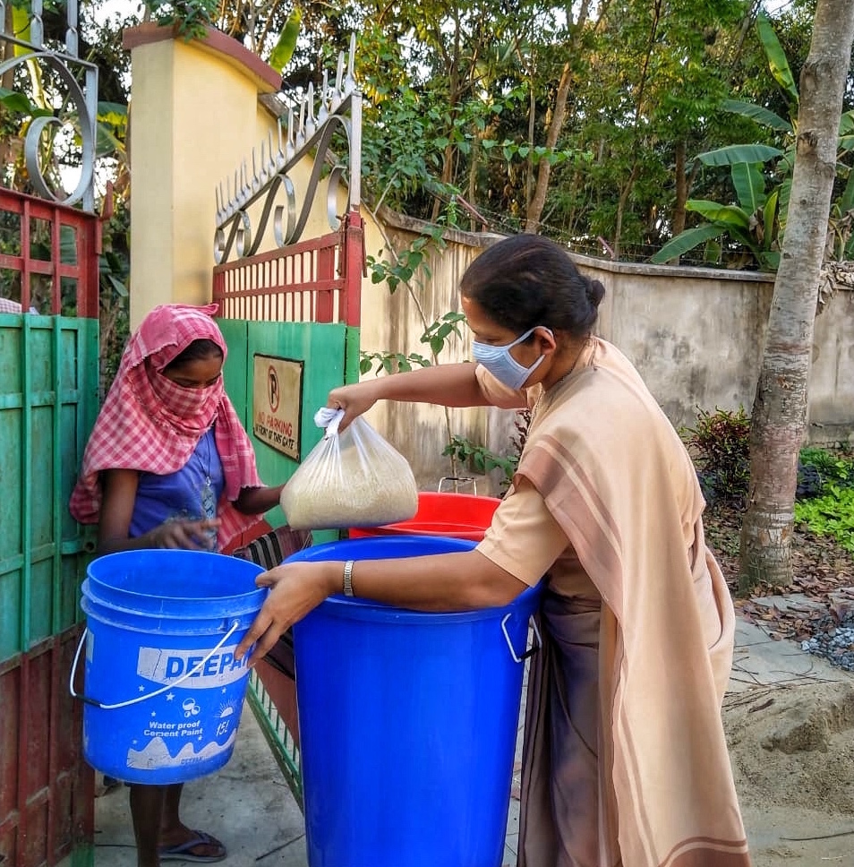 A food bank established at the gates of the Bethany Convent compound distributes essential supplies to abandoned brick kiln workers – West Bengal, India.